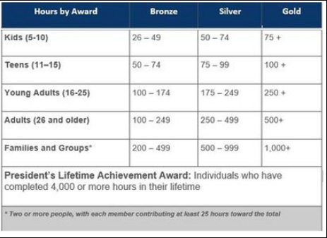 - Completes eligible service within a 12-month period (for annual Bronze, Silver, and Gold Awards) and over a lifetime (for Lifetime Achievement Awards)